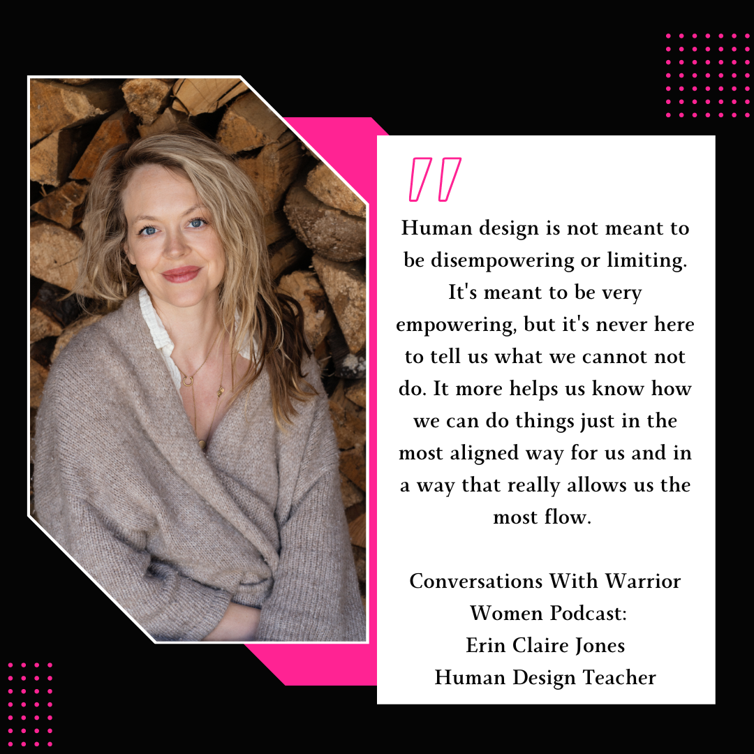 Today we are deep diving into Human Design with Erin Claire Jones! Erin uses Human Design, which is an energetic blueprint that is wildly accurate and insightful, to help thousands of people and companies step into their work and their lives as their truest selves and to their highest potential. We talk about what Human Design is, how to use it, and how Erin and I have used it in our own lives.
